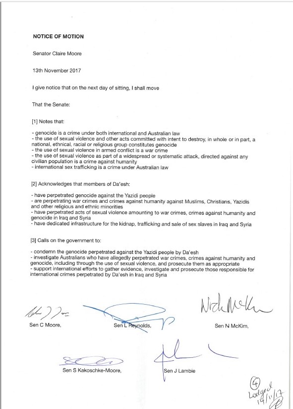 The Senate passed a motion acknowledging Da’esh’s use sexual violence amounting to war crimes, crimes against humanity and genocide, and the dedicated infrastructure for trafficking and slavery of women and girls. It called on the government to investigate Australians who have allegedly perpetrated war crimes, crimes against humanity and genocide, including through the use of sexual violence, and prosecute them as appropriate and to support international efforts to gather evidence, investigate and prosecute those responsible for international crimes perpetrated by Da’esh in Iraq and Syria. The motion was co-sponsored by members of each political party as well as notable independents. Labor Senator for Queensland, Claire Moore put the motion to the Senate on behalf of Liberal Senator for Western Australia, Linda Reynolds; Greens Senator for Tasmania, Nick McKim; South Australian Senator from the Nick Xenaphon Team, Skye Kakoschke-Moore; and Independent Senator for Tasmania, Jacqui Lambie.